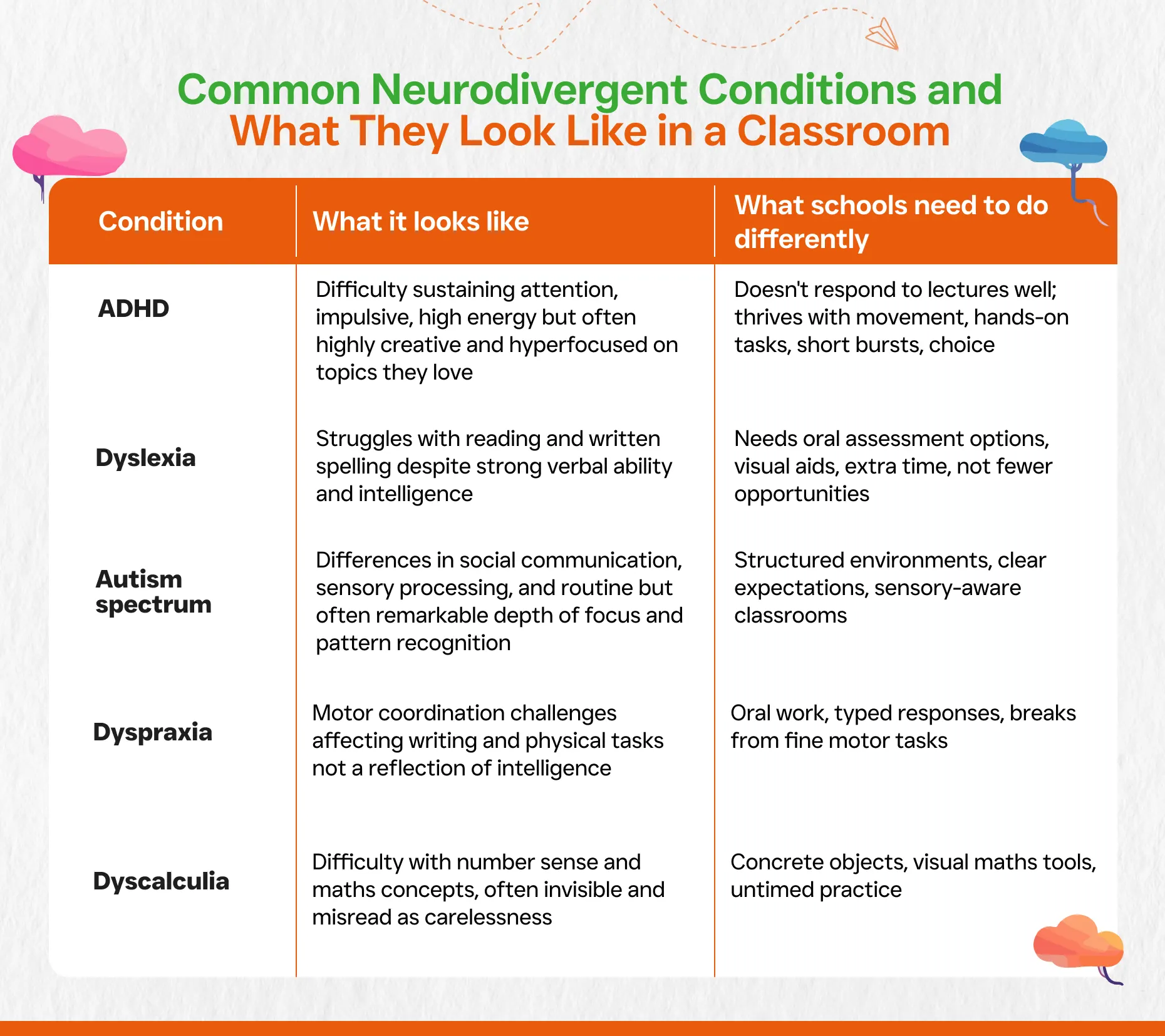 Crucially, neurodivergence is not the same as low intelligence. Many neurodivergent children have high cognitive ability in specific areas. What changes is not their capacity to learn, it is the method by which they learn most effectively. A child with dyslexia may have exceptional verbal reasoning. A child with ADHD may have remarkable creative thinking and hyperfocus when engaged. A child on the autism spectrum may have extraordinary depth of focus and pattern recognition. These are not consolation prizes. They are genuine strengths, ones that go unrecognised in a classroom built only for one type of mind.