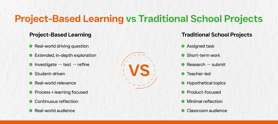 Sustained Inquiry: PBL unfolds over days, weeks, or even months. Students don’t just research and report, they investigate, test hypotheses, gather evidence, consult experts, and revise their thinking continuously.